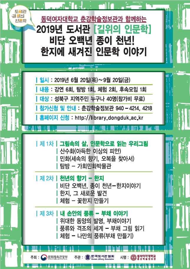 동덕여자대학교 춘강학술정보관(관장 윤복희)이 문화체육관광부가 주최하고, 한국도서관협회에서 주관하는 「2019년 도서관 길 위의 인문학」 공모사업에 선정되어 “비단 오백년 종이천년!한지에 새겨진 인문학” 프로그램을 진행한다.