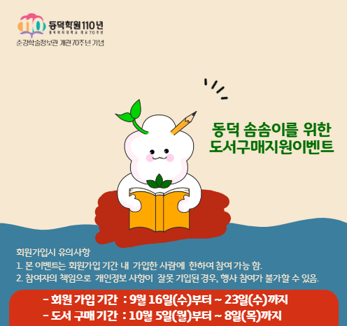 - 동덕학원 창학110년, 동덕여대 개교70주년, 춘강학술정보관 개관70주년을 맞이하여, 춘강학술정보관과 교보문고가 함께 하는 전국 최초 '비대면 온라인 도서구매지원이벤트’
